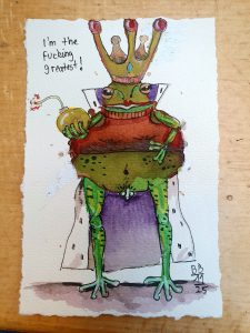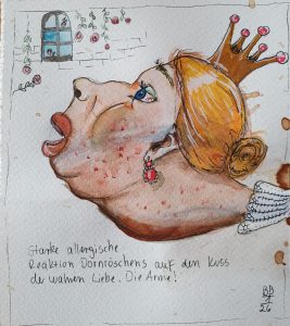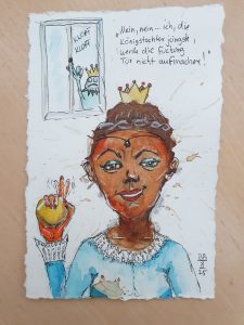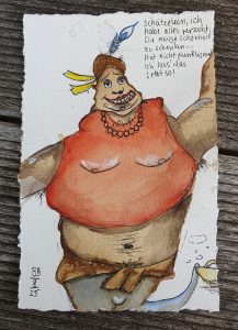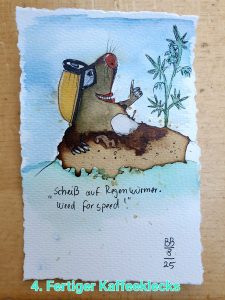 Verschütteter Kaffee auf Aquarellpapier und manchmal irrwitzige kleine Comicbilder daraus zu erstellen macht meinen Kopf frei. Mittlerweile habe ich zwei Herangehensweisen. Ich sehe den Fleck und schon drängt sich ein Bild auf. Welches ich dann mit Aquarellfarben und Fineliner ausarbeite. Oder ich habe eine Idee und suche aus meinem Repertoire den passenden Klecks aus, um diesen dann mit den gleichen Mitteln auszuarbeiten. Eine Auswahl ist hier zu sehen.